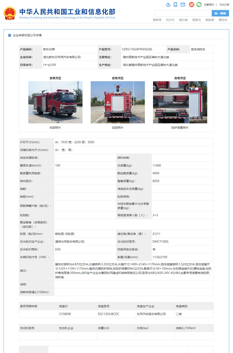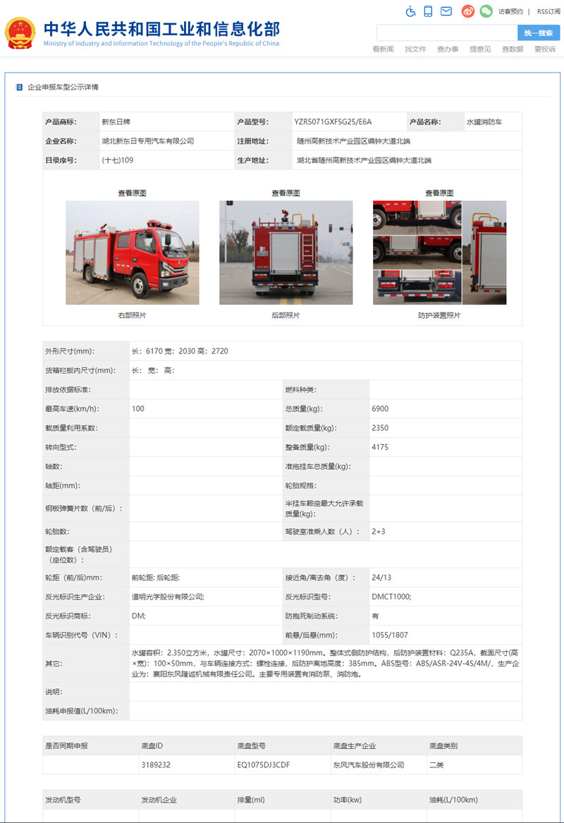 根據(jù)《道路機(jī)動(dòng)車輛生產(chǎn)企業(yè)及產(chǎn)品公告》管理和《財(cái)政部 稅務(wù)總局 工業(yè)和信息化部 交通運(yùn)輸部關(guān)于節(jié)能 新能源車船享受車船稅優(yōu)惠政策的通知》(財(cái)稅〔2018〕74號(hào))的有關(guān)要求,現(xiàn)將《道路機(jī)動(dòng)車輛生產(chǎn)企業(yè)及產(chǎn)品公告》(第343批)中可以看到,我公司有兩款消防車公告公示,東風(fēng)2.5噸水罐消防車和東風(fēng)5噸泡沫消防車。