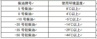 為了使發(fā)動機(jī)擁有更高的可靠性和更好的經(jīng)濟(jì)型,柴油應(yīng)選用符合19147-2018國六標(biāo)準(zhǔn)的正規(guī)柴油,并隨著地區(qū)環(huán)境氣溫的不同而選用不同牌號的清潔柴油。根據(jù)使用環(huán)境氣溫,按下表選用不同牌號的清潔柴油: